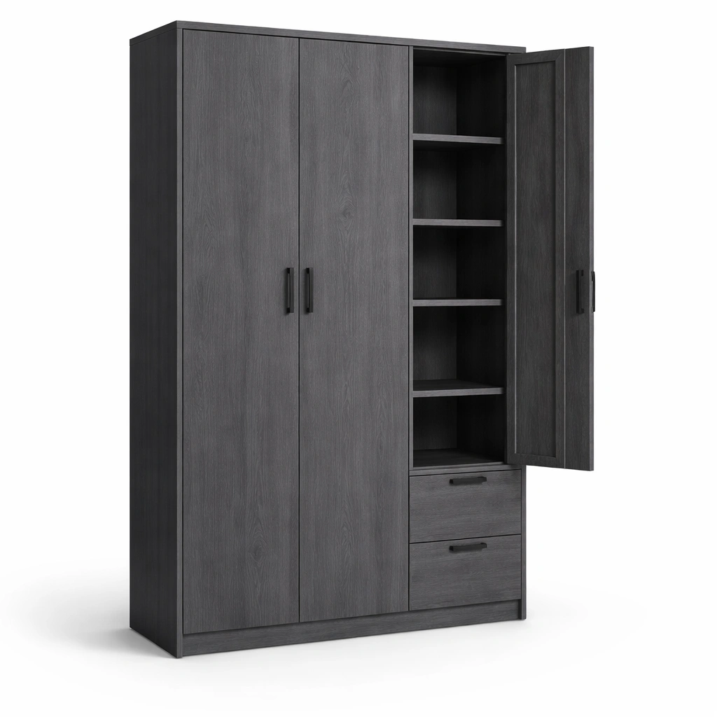 Armoire bois gris portes battantes étagères tiroirs